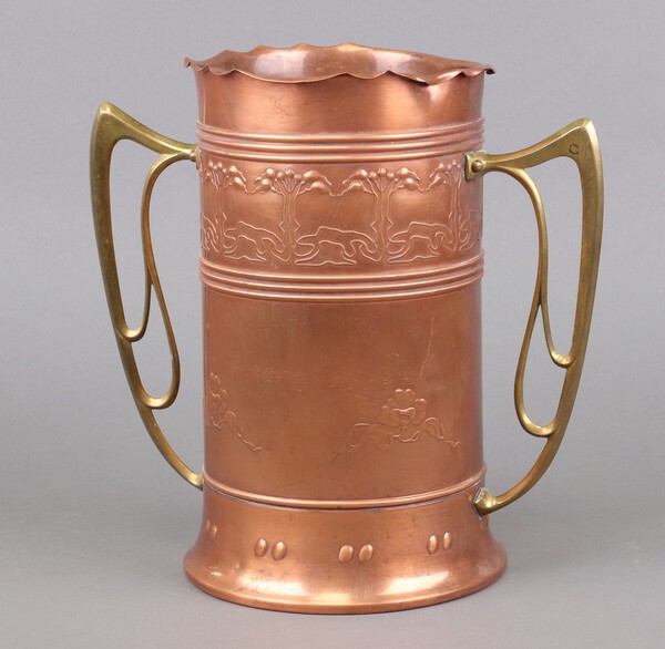 Lot 581 An Art Nouveau Continental embossed copper and brass twin handled vase of waisted form, the base cast stylised flower heads 25cm x 16cm SOLD £60