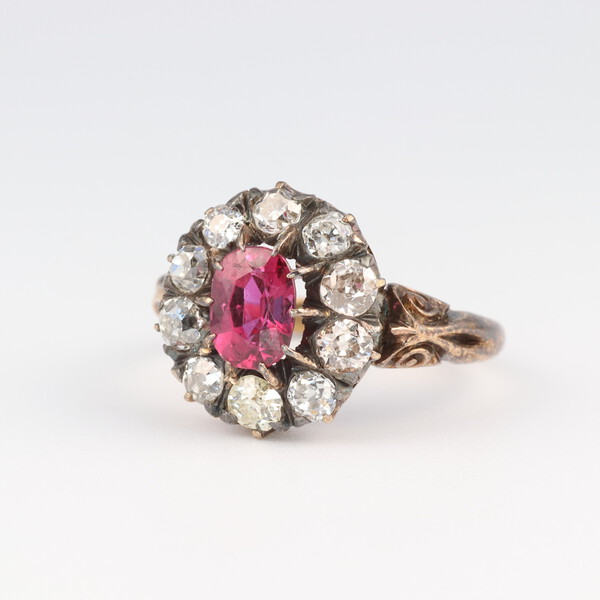 An 18ct yellow gold oval ruby and diamond cluster ring, the centre stone approx. 1ct, the 10 brilliant cut diamonds 0.5ct, size M, 4.2 grams