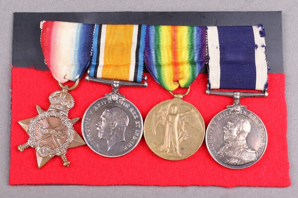 A group of 4 medals comprising 1914-15 Star, British War medal, Victory medal and George V issue Naval Long Service Good Conduct medal, the first three medals named R.M.B 1248 B D Corporal G W Hooper, the Naval Good Conduct medal named R.M.B. 1248 G W Hooper Bomr 2 HMS Ajax, mounted for wear