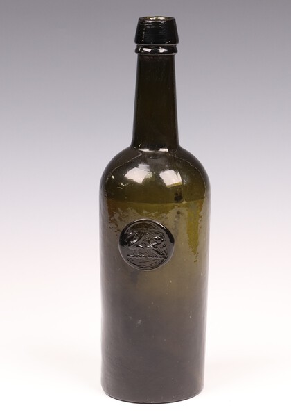 An 18th/19th Century Bristol green glass wine bottle with pictorial seal of a swan & rampant lion seal, the base marked Powell Bristol 28cm x 8cm