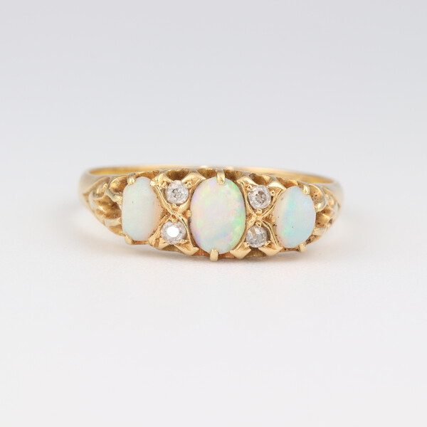 Lot 62 An 18ct yellow gold dress ring set 3 oval opals supported by 4 small diamonds, size P 1/2, 2.6 grams £70-90