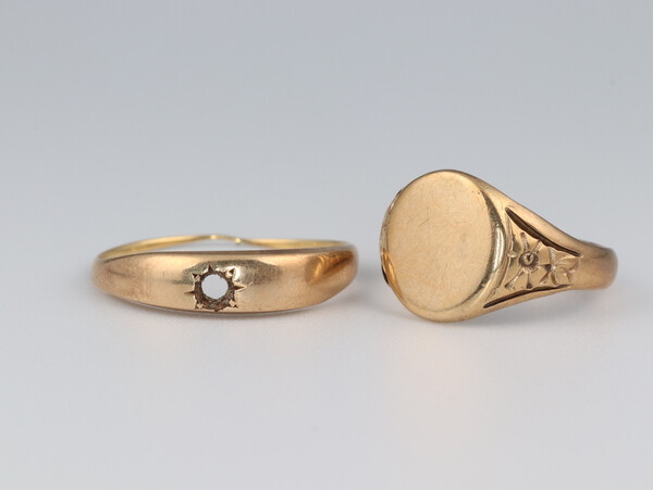 Two 9ct yellow gold rings, size G and N 1/2, 4.5 grams