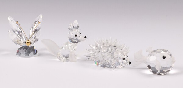 Lot 639 Four Swarovski Crystal figures - puffer fish 5cm, a hedgehog, dragon fly and fox, all boxed £40-50