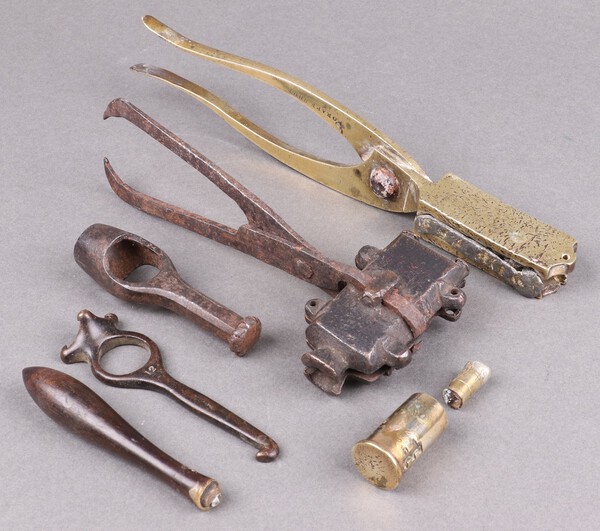 Lot 641 An 18th Century metal tongue bullet mould with inscription to arm, a brass and lead grape shot mould, 2 wadding punches and a measure £40-60