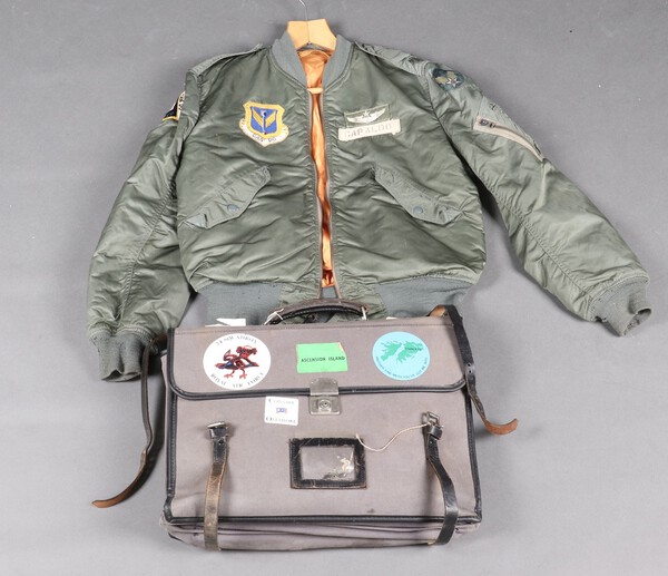 Lot 652 A USAF Type L-2B M1-A bomber jacket, an RAF Air Crew navigator/pilots bag containing and A-N US Navy Rude star indicator type 1, 3 pilots dead reckoning computers, a Douglas combined protractor etc £40-50