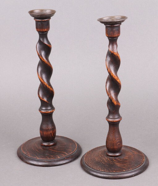 A pair of 1930's oak spiral turned candlesticks with metal sconces 31cm
