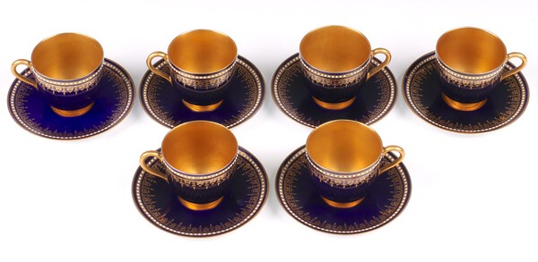 Lot 699 A Royal Worcester 12 piece demitasse coffee service comprising 6 cups and 6 saucers, bases with purple Royal Worcester mark and 25 dots £40-60