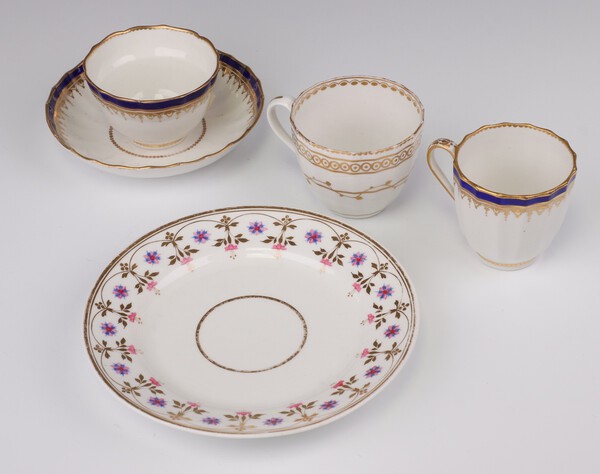 An 18th Century Royal Crown Derby blue and gilt banded tea bowl the base with cypher mark, a similar cup, 18th Century Derby blue and gilt banded cup and circular Bloor Derby plate with gilt and floral decoration 18cm