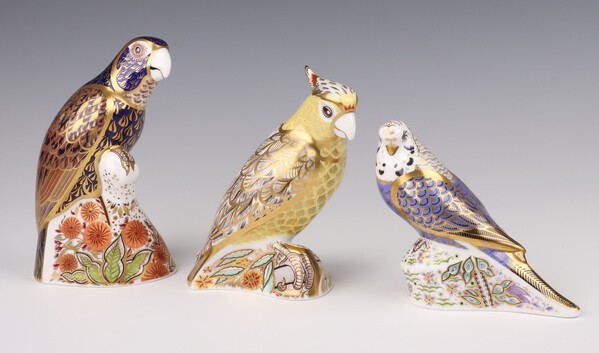 Three Royal Crown Derby Imari pattern paperweights - Bronzed winged parrot 2005 with gold stopper 16cm, Citron Cockatoo MMVIII gold stopper 13cm, Violet Budgerigar MMVIII 10cm, all boxed