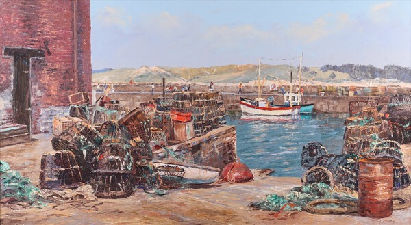 Lot 771 **Nancy Bailey (1913-2012), "Pots and Things, Padstow", 20th century oil on canvas, signed recto, titled verso, 49cm x 90cm, within a gilt frame ** Please note - Artists Re-sale Rights may be payable on this lot £150-200
