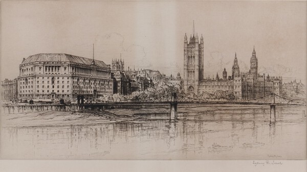 **Sydney Robert Jones (British, 1891-1966), A View of the Thames with Old Lambeth Bridge and the Palace at Westminster, early 20th century etching, signed in pencil, 20cm x 38cm, within a wood frame ** Please note - Artists Re-sale Rights may be payable on this lot