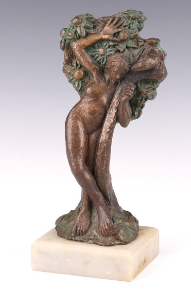 Lot 797 Laurence Tindall, (British), "Temptation of Eve", a patinated and painted bronze figure on a white marble plinth 24.5cm h £120-150