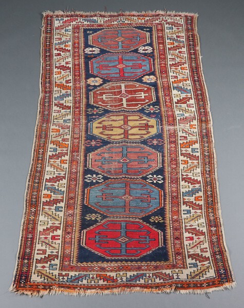 Lot 853 A blue and white ground Caucasian style runner with 7 octagons to the centre 195cm x 103cm £50-75