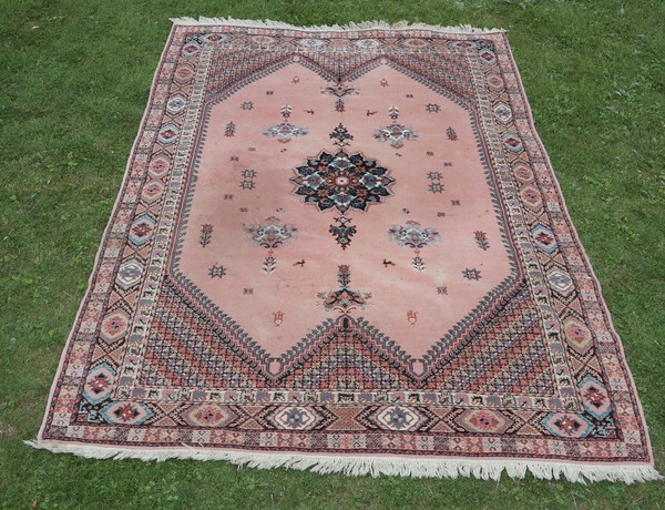 Lot 858 A pink and blue ground Moroccan carpet with central medallion within a multi row border 303cm x 213cm £80-120