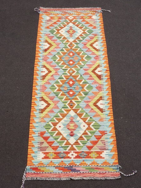 Lot 860 A yellow, green and turquoise ground Chobi Kilim runner with 4 diamonds to the centre 203cm x 63cm £45-55