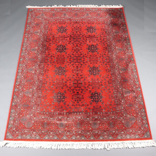 Lot 861 A red, white and black ground machine made Persian style rug with 2 rows of stylised medallions to the centre 237cm x 170cm £50-75