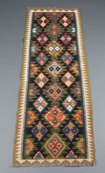 Lot 865 A black, green and white ground Maimana Kilim runner with overall diamond design 198cm x 168cm £50-75