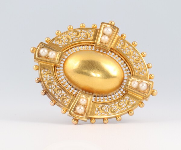 Lot 9 A Victorian 14ct yellow gold Etruscan style brooch set with 8 seed pearls, 15.5 grams gross, 52mm SOLD £520