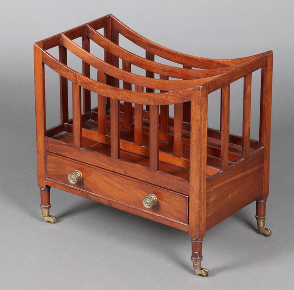 Lot 905 A 19th Century mahogany 3 section Canterbury, the base fitted a drawer, raised on brass caps and casters 49cm h x 51cm w 30cm d £60-80