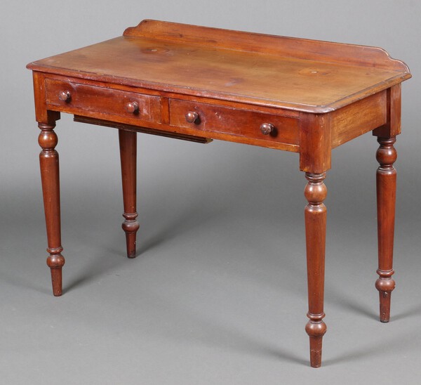 A Victorian bleached mahogany dressing table with raised back, fitted 2 drawers and a crude secret drawer to the underside, raised on turned supports 78cm h x 104cm w x 46cm d