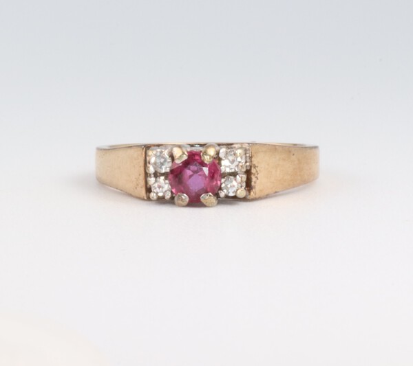 Lot 91 A 9ct yellow gold ruby and diamond ring, the brilliant cut ruby 0.25ct, the 6 brilliant cut diamonds 0.07ct, size N, 3 grams SOLD £75