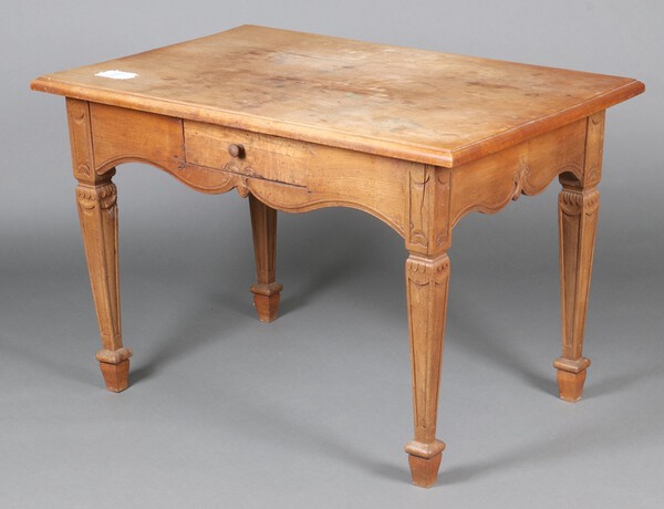 A 19th Century Continental rectangular carved oak side table fitted a frieze drawer, raised on square tapered supports with spade feet 76cm h x 116cm w x 78cm d