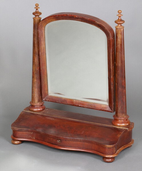 Lot 990 A Victorian arched bevelled plate dressing table mirror contained in a mahogany swing frame supported by 2 columns to the sides, the base of serpentine outline fitted a glove box 79cm h x 67cm w x 29cm d SOLD £40