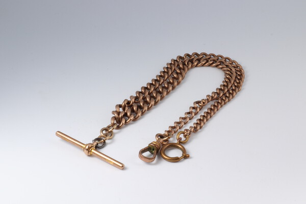 Lot 1 A 9ct yellow gold curb link double Albert watch chain 40cm, (one link is not gold and the 2 end clips are not gold) 33.8 grams gross £900-1100
