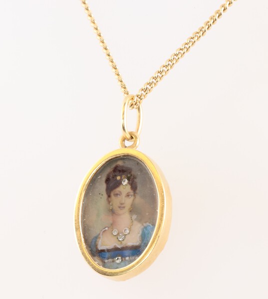 Lot 100 A gold marked 750 oval pendant with miniature portrait set white stones on a gilt metal chain £80-100