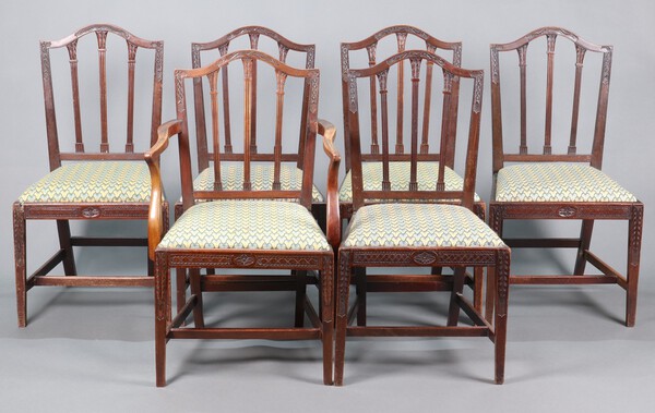 A set of 6 19th Century mahogany stick and rail back dining chairs - 1 carver, 5 standard chairs with upholstered drop in seats, raised on square tapered supports with H framed stretchers 93cm h x 55cm w