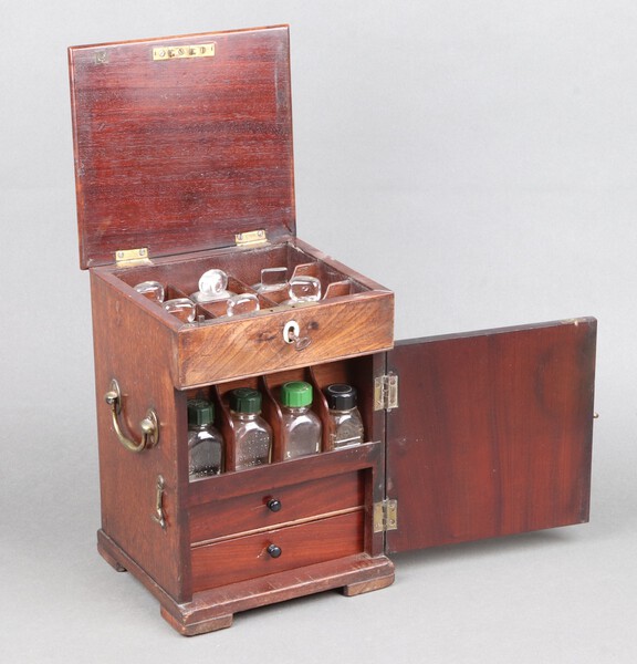 A Georgian mahogany apothecaries cabinet, the hinged lid revealing 6 panel cut bottles, the cupboard to the front fitted 4 later bottles, compartmented drawer with sliding lids and 1 other long drawer with ivory escutcheon and brass swan neck drop handles to the sides 24cm h x 18cm w x 16cm d Ivory Exemption Certificate JPKEES4E
