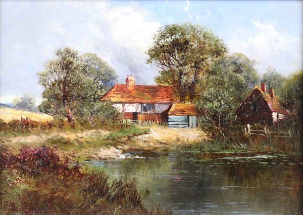 Lot 1008 Phil Hips (Francis E. Jamieson) (British, 1895-1950), "Sussex Landscape with Farm buildings and Lake", early 20th century oil on canvas, signed, 24cm x 34cm, within a painted and gilt wood frame. £60-80