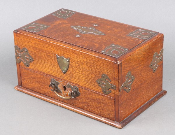 Lot 1011 A Victorian rectangular oak and metal mounted cigar box with patented action lid, the base fitted a drawer marked RD225578 15cm h x 30cm w x 17cm d £50-75