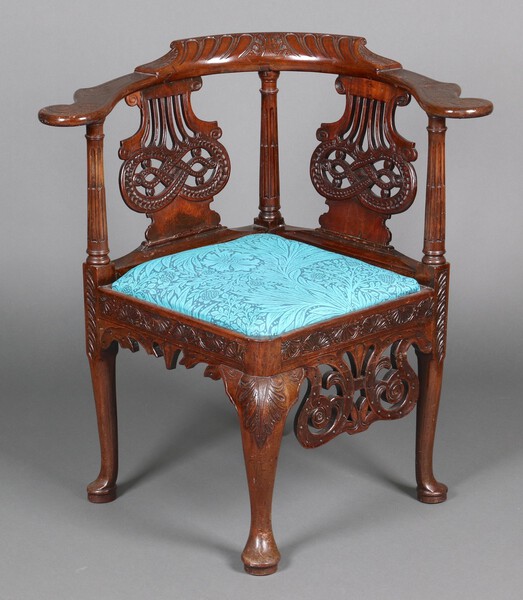 A Georgian carved and pierced mahogany slat back corner chair with turned and reeded columns to the back, raised on club supports 81cm h x 80cm w x 58cm d