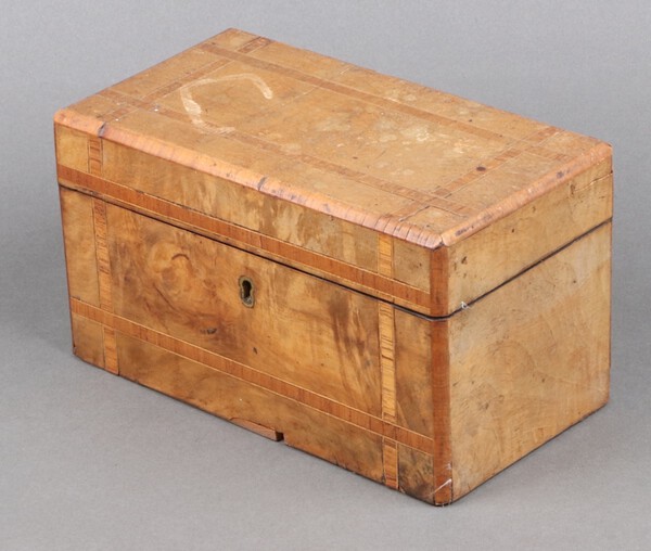 Lot 1013 A rectangular inlaid walnut twin compartment tea caddy with hinged lid, the interior fitted 2 compartments with lids 12cm h x 22cm w x 12cm d £30-40