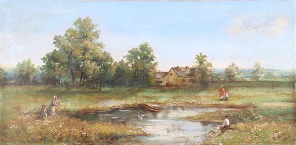 Attributed to Rose Maynard Barton (Irish, 1856-1929), Landscape with Farm Buildings and Figures near a Pond, oil on canvas, signed and dated 1896, 30cm x 61cm. Note: We can find no anomalies under UV examination and so believe that this intriguing work offers the possibility that Rose Barton experimented with oils during her notable career.  £80-120