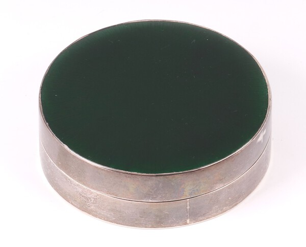 Lot 102 A Victorian silver jar and cover with green gouache enamelled cover, London 1898 by Wright & Davies 7.5cm, gross weight 126 grams £70-90