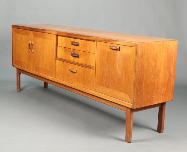 Lot 1021 G-Plan, a mid-Century teak sideboard fitted 3 drawers flanked by a cupboard enclosed by a pair of panelled doors and with cocktail unit to the side 80cm h x 206cm w x 46cm d £200-300