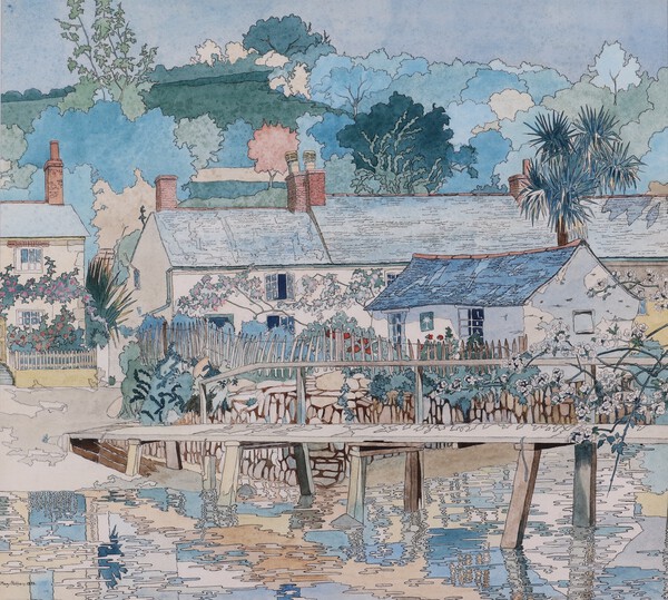 Lot 1035 Mary Oldham (British, fl.1924-1940), Cornish Landscape, ink with watercolour, signed and dated 1933, 45cm x 50cm, within a silvered frame. £50-75