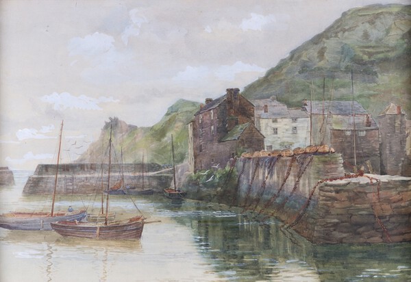 Lot 1036 Circle of Herbert Edward Butler, Polperro Harbour, Cornwall, early 20th century watercolour, 41cm x 60cm, within a painted and gilt wood frame. £40-60