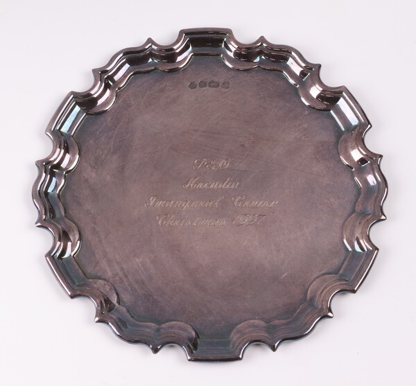 Lot 104 A silver salver with bracketed border and engraved inscription P & O Arcadia Inaugural Cruise Christmas 1997, Sheffield 1997, by Carr's, 12cm, 96 grams £60-80
