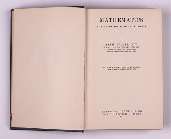 LOW, Bevis Brunel. Mathematics, A Text-Book For Technical Students. London: Longmans, Green and Co, 1931. 8vo, 448pp. Original blue cloth, gilt lettered spine. Fading to spine and cover, rubbing to corners and edges of spine, tear to edge of spine. Signed B.N. Wallis.