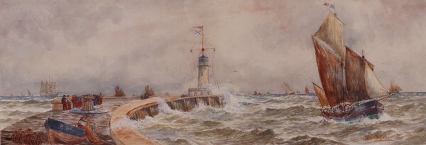 William G. Whittington (act.1904-1914), Maritime Scene with several Sailing vessels in a stiff breeze near a Harbour Pier with Lighthouse, 19th century watercolour, signed, 27cm x 76cm, within a gilt frame.  £800-1000
