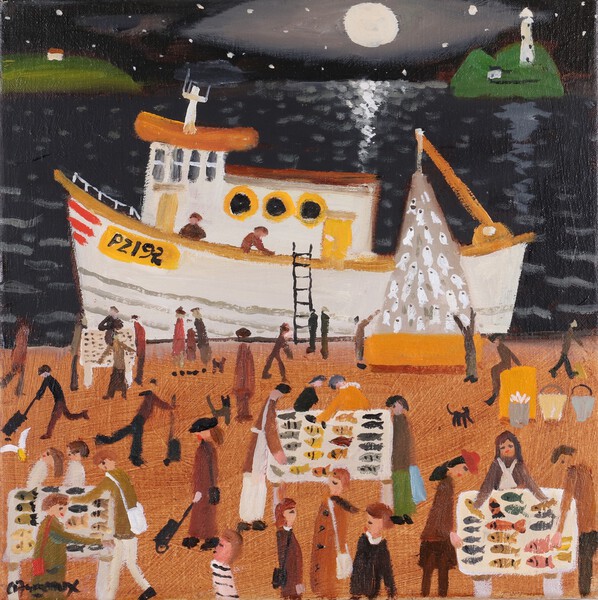 Lot 1047 Alan Furneaux (British, b.1953), Newlyn Harbour Scene under Moonlight, oil on canvas, signed recto, titled verso, 38cm x 38cm, within a painted wood frame. £300-400