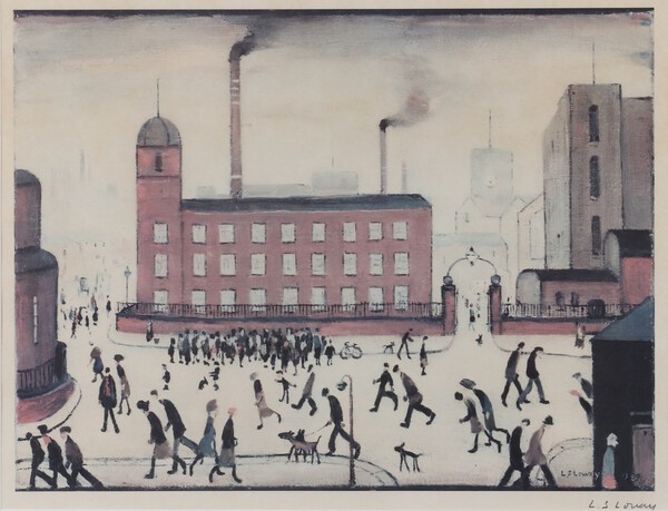 **Laurence Stephen Lowry (British, 1887-1976), Mill Scene, offset lithograph, signed in pencil, from an edition of 750 printed by Curwen Press and published by the Sunday Observer in 1972, 33cm x 42cm, within a stained wood frame.**Please Note - Artists Resale Rights may be payable on this lot.