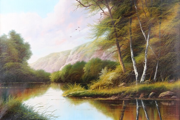 Lot 1058 Andrew Grant Kurtis M.A. (British, born 1963), river scape with trees and mountains in distance, oil on canvas 59cm x 90cm, artist stamp verso, within a gilt frame £120-180