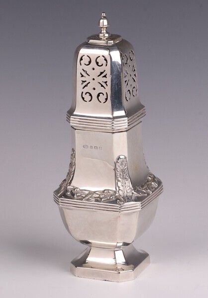 Lot 106 A Georgian style silver octagonal sugar caster Birmingham 1932 by Alexander Clark & Company Ltd., 21cm h, 227 grams £200-250