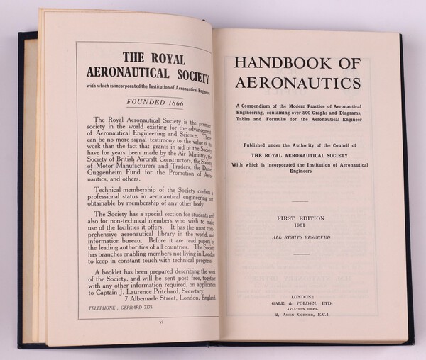 The Royal Aeronautical Society. Handbook of Aeronautics. London: Gale & Polden Ltd. 8vo, 703pp. Original blue cloth with gilt lettered spine. Fading to spine and cover, minor rubbing to corners and edges of spine, foxing to pastedown, endpaper and back papers. First Edition 1931. Signed B.N. Wallis Oct.1931