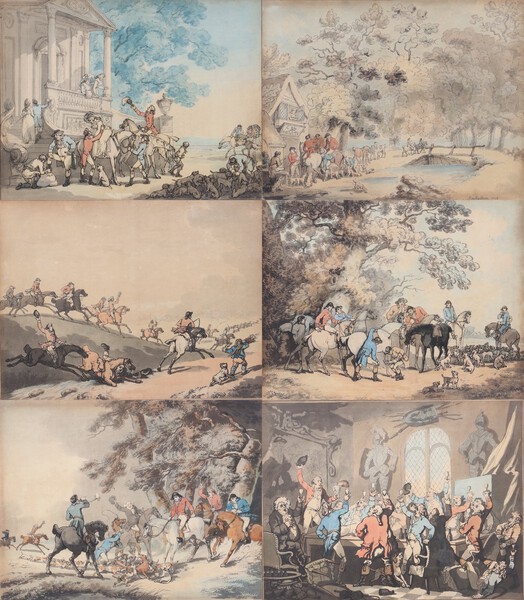 Thomas Rowlandson (British, 1756-1827), "Going out in the Morning", "The Chase", "The Death of the Fox", "The Refreshment", "The Return", and "The Dinner", the set of six etchings with aquatint and hand-colouring on laid paper, published by J. Harris 1787 and 1788, each 39cm x 51cm, all within matching gilt frames.