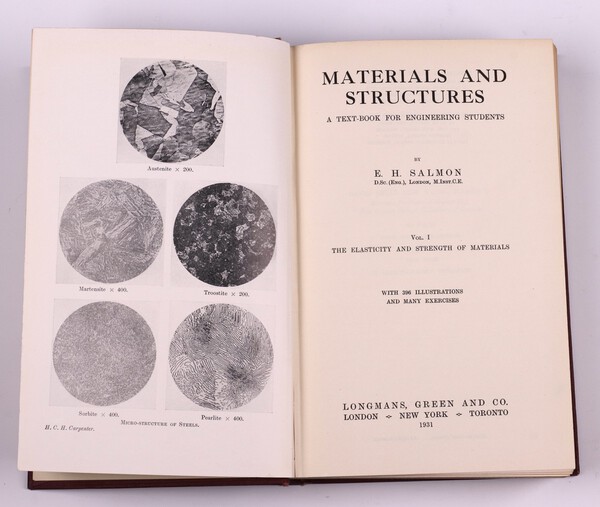 Lot 108 SALMON, E. H. Materials and Structures. London: Longmans, Green and Co 1931. 8vo, 638pp. Original maroon cloth with gilt lettered spine. Minor rubbing to covers and edges of spine. Signed B.N. Wallis £80-120